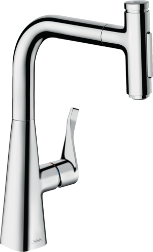 Однорычажный кухонный смеситель, корпус для шланга, ComfortZone 240, L-образный излив, угол поворота излива: регулировка на 2 уровня, на 110° или 150°, ламинарная струя, душевая струя, фиксируемая душевая струя, автоматическое переключение струи в исходный режим закрытием смесителя, кнопка Select для комфортного включения/выключения воды, магнитная система крепления душа MagFit, максимальный расход воды при давлении 3 бара: 7 л/мин., керамический узел смешивания, соединительные шланги G ⅜, регулируемое ограничение температуры, встроенный клапан обратного тока воды, подходит для проточных .водонагревателей, короб sBox для тихого, плавного, безопасного перемещения шланга в кухонном шкафу, под столешницей, длина удлинения До 76 см. Есть вариант в цвете нержавеющая сталь - арт. 73817800