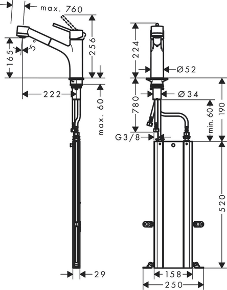 Кухонный смеситель однорычажный, с вытяжным душем, ComfortZone 170, угол поворота излива: 150°, обычная струя, душевая струя, фиксируемая душевая струя, автоматическое переключение струи в исходный режим закрытием смесителя, максимальный расход воды при давлении 3 бара: 10 л/мин, керамический узел смешивания, соединительные шланги G ⅜, регулируемое ограничение температуры, встроенный клапан обратного тока воды, подходит для проточных водонагревателей, короб sBox для тихого, плавного, безопасного перемещения шланга в кухонном шкафу, под столешницей, длина удлинения до 76 см. Есть вариант в цвете нержавеющая сталь - арт. 73860800