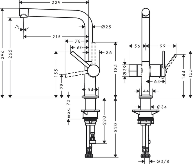 Кухонный смеситель, однорычажный, с запорным вентилем, ComfortZone 270, диапазон поворота регулируется в 4 шага 60 °, 110 °, 150 ° или 360 °, ламинарный спрей, со встроенным запорным клапаном, размер соединения: DN15, максимальный расход при давлении 3 бара: 8 л / мин, керамический картридж, тип подключения: G ⅜ соединения, ограничение температуры регулируемое, подходит для проточных водонагревателей, требуется отверстие под смеситель Ø 35 мм. Есть варианты в других цветах: - черный матовый - арт. 72827670 - цвет нержавеющая сталь - арт. 72827800