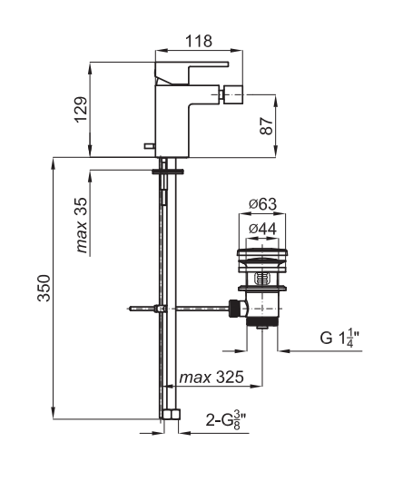 Однорычажный смеситель для биде с керамическим картриджем ᴓ 35 мм. Подключение 3/8", длина шлангов 370 мм, с автоматическим клапаном слива и аэратором "plus". Пропускная способность при давлении 3 бара 12,08 л/мин.