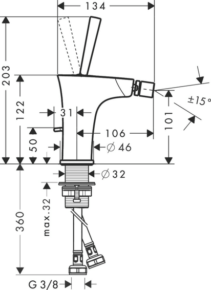 Однорычажный смеситель для биде, слив/перелив, формирователь струи с шарнирным соединением, тип струи: ламинарная струя, максимальный расход воды при давлении 3 бара: 7,2 л/мин, керамический узел смешивания джойстикового типа, подходит для проточных водонагревателей, материал сливного набора: металл. Есть вариант в бело-хромовом цвете - арт. 15270400
