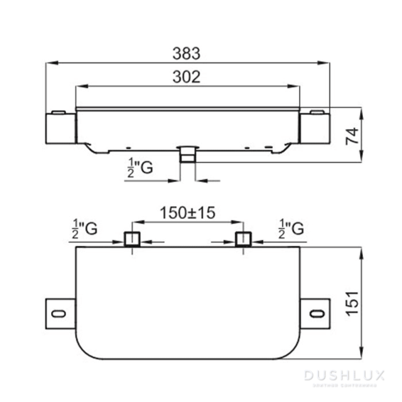 Наружный смеситель - белое стекло с термостатом для душа с элементом покрытия из воска. Подключение 1/2", включает обратный клапан и предохранитель на 38 ⁰С. Расстояние между выходами 150+/-15 мм. Пропускная способность при давлении 3 бара 14,8 л/мин.
