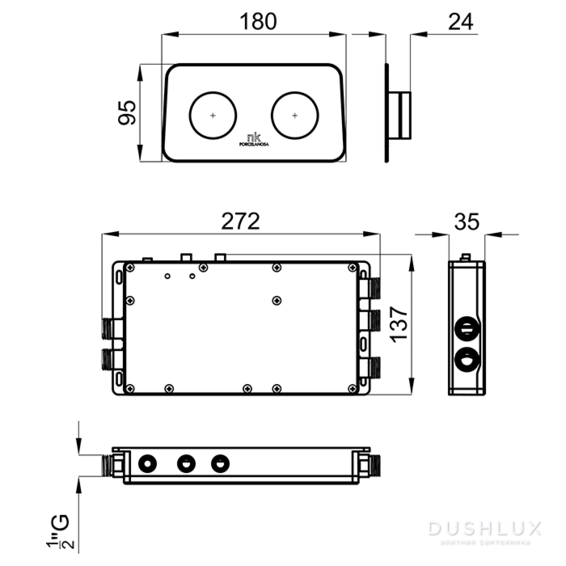 Цифровой термостат на три выхода с подключениями 1/2" и обратным клапаном. Две ручки управления со светодиодной подсветкой. Стоп безопасности. Пропускная способность при давлении 3 бара 27,5 л/мин. В комплект входит трансформатор 100-240 В, 50/60 Гц, выходное напряжение 15 В. Термостат независимый 225*130*55 мм.