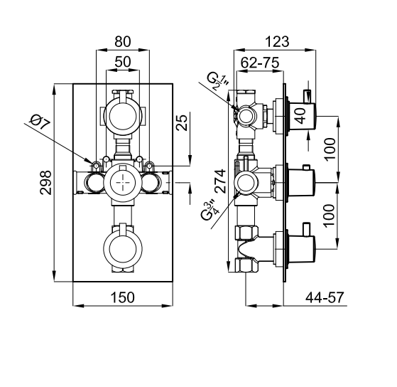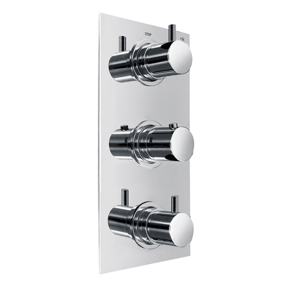 Смеситель с термостатом скрытого монтажа на три отверстия с восковым элементом. Подключение 1/2" - 3/4" согласно плану. Регулятор пропускной способности. Пропускная способность при давлении 3 бара: за один выход - 26 л/мин, другой - 16 л/мин и третий - 45,5 л/мин. Включает один выход большого давления с независимым ручным душем, клапан слива анти-возвращение и предохранитель на 38 ⁰С.