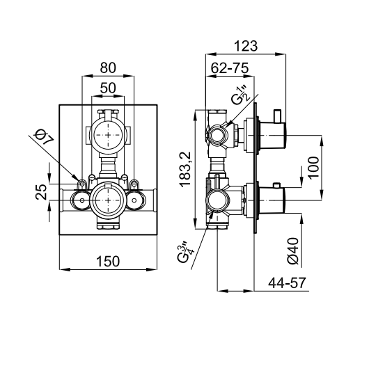Смеситель с термостатом скрытого монтажа на два отверстия с восковым элементом. Подключение 1/2" - 3/4" согласно плану. Регулятор пропускной способности. Пропускная способность при давлении 3 бара: 1 выход - 26 л/мин и на 2-ой выход - 13 л/мин. Включает обратный клапан и предохранитель на 38 ⁰С
