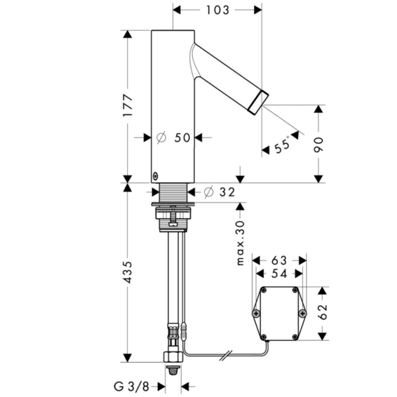 Смеситель для раковины, электронный, с регулировкой температуры, питание от батареек, ComfortZone 90, выступ 103 мм, тип струи: обычная струя, максимальный расход воды при 3 бар: 5 л/мин, температура регулируется посредством бокового смешивающего рычага, подходит для проточных водонагревателей, инфракрасный электронный датчик, срабатывающий на приближение, автоматическая адаптация инфракрасного датчика к окружающим условиям, регулируемое оптическое расстояние для инфракрасного сенсора (2 положения), питание от батареи 6 V (батарея включена в комплект поставки), частота циклов промывания: 24 часа, время промывки: 10 с, ручное прекращение подачи воды для чистки раковины, вид соединения: соединительные шланги G ⅜, грязеулавливающие фильтры в соединительных шлангах.