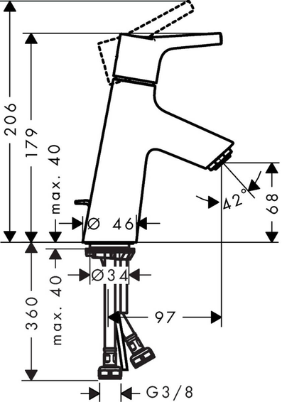 Однорычажный смеситель для раковины, слив/перелив, ComfortZone 80, выступ 97 мм, тип струи: обычная струя, максимальный расход воды при давлении 3 бара: 2,7 л/мин, керамический узел смешивания, регулируемое ограничение температуры, подходит для проточных водонагревателей, материал сливного набора: металл, вид соединения: соединительные шланги G ⅜, донный клапан, 1¼’.