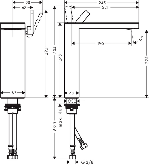 Смеситель для раковины состоит из однорычажного смесителя для раковины, плиты, слив/перелива, ComfortZone 230, выступ 196 мм, пластина из безопасного стекла, тип струи: PowderRain, максимальный расход воды при давлении 3 бара: 5 л/мин, керамический картридж, регулируемое ограничение температуры, с изолированной подачей воды, подходит для проточных водонагревателей, вид соединения: соединительные шланги G ⅜, рукоятка расположена в верхней части корпуса (обычно для раковин в форме таза), сливной клапан Push-Open G 1 ¼. Есть вариант в цвете зеркальный черный хром - арт. 47020600