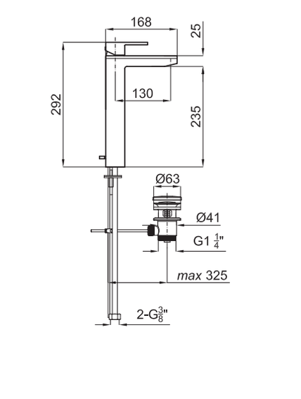 Однорычажный смеситель для раковины с высоким изливом и керамическим картриджем ᴓ 35 мм. Подключение 3/8", длина шлангов 370 мм, с автоматическим клапаном слива и аэратором "plus". Пропускная способность при давлении 3 бара 12,01 л/мин.