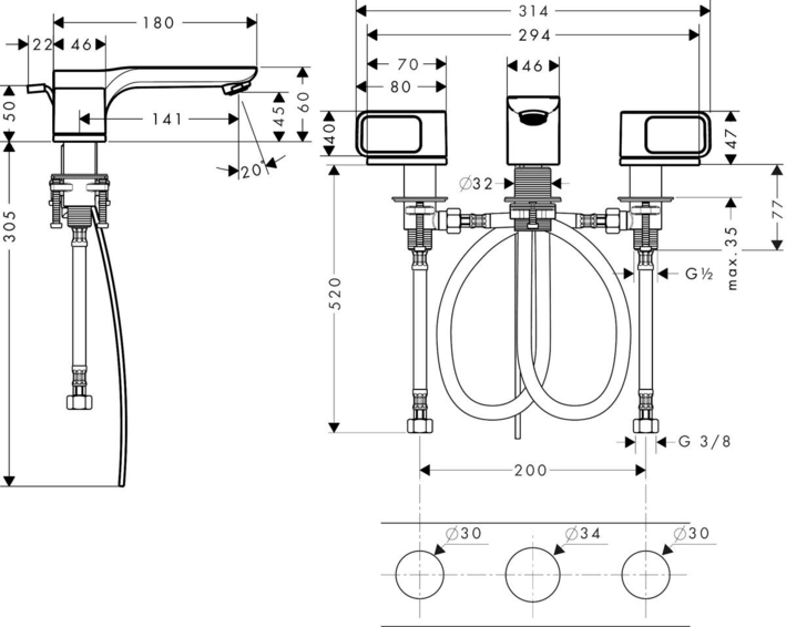 Смеситель для раковины, с отдельными розетками, со сливным гарнитуром состоит из смесителя для раковины, на 3 отверстия, слив/перелива, ComfortZone 50, выступ 180 мм, тип струи: обычная струя, максимальный расход воды при давлении 3 бара: 5 л/мин, с керамическими вентилями для горячей/холодной воды 90°, подходит для проточных водонагревателей, вид соединения: соединительные шланги G ⅜, донный клапан, 1¼’.