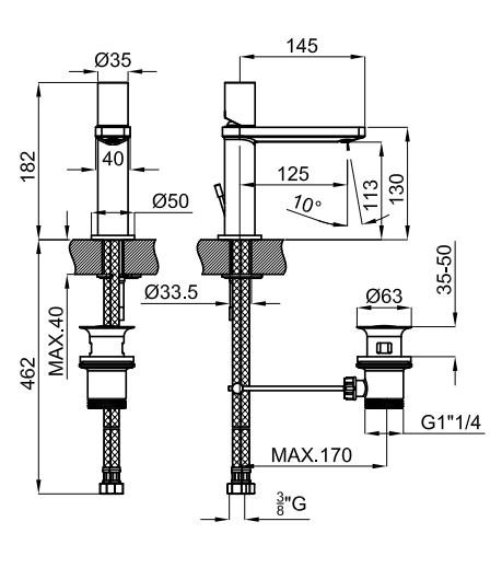 Однорычажный смеситель для раковины с керамическим картриджем ᴓ 25 мм. Подключение 3/8", длина шланга 462 мм. Автоматический сливной клапан и аэратор "plus". Открытие на холодную. Пропускная способность при давлении 3 бара 4,27 л/мин.