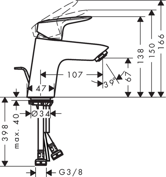 Однорычажный смеситель для раковины, слив/перелив, ComfortZone 70, выступ 107 мм, тип струи: обычная струя, максимальный расход воды при давлении 3 бара: 9,5 л/мин, керамический узел смешивания с двумя вариантами расхода воды, регулируемое ограничение температуры, подходит для проточных водонагревателей, материал сливного набора: синтетический, вид соединения: соединительные шланги G ⅜, донный клапан, 1¼’.