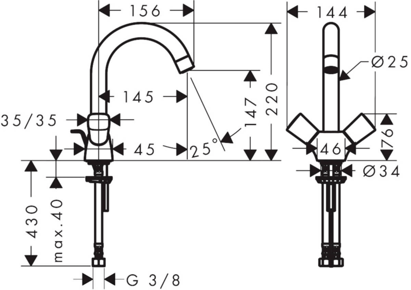 Смеситель для раковины, с 2 рукоятками, слив/перелив, ComfortZone 150, выступ 145 мм, угол поворота излива: 120°, тип струи: обычная струя, максимальный расход воды при давлении 3 бара: 5 л/мин, с керамическими вентилями для горячей/холодной воды 90°, подходит для проточных водонагревателей, материал сливного набора: синтетический, вид соединения: соединительные шланги G ⅜, донный клапан, 1¼’.