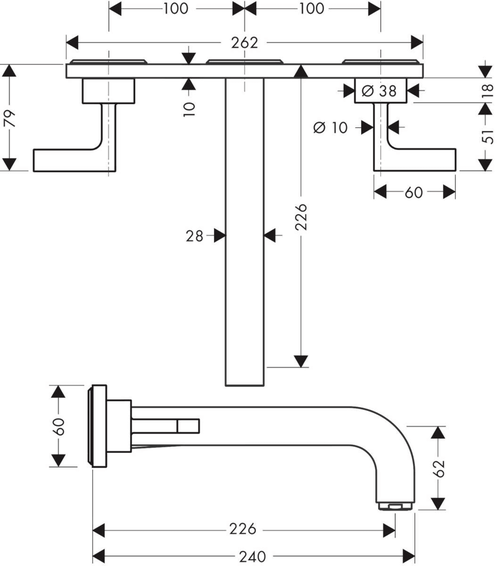 Смеситель для раковины состоит из смесителя для раковины на 3 отверстия, настенный, для скрытого монтажа, слив/перелива, выступ 226 мм, тип струи: обычная струя, максимальный расход воды при давлении 3 бара: 5 л/мин, с керамическими вентилями для горячей/холодной воды 90°, подходит для проточных водонагревателей, вид соединения: скрытая часть, сливной набор без опции перекрытия стока. Есть варианты в разных цветах с полированной и шлифованной обработкой.
