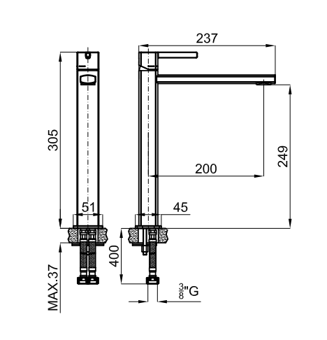 Однорычажный смеситель для раковины 305мм с высоким изливом и керамическим картриджем ᴓ 25 мм. Подключение 3/8". длина шлангов 400 мм, без автоматического клапана слива и с аэратором "plus". Открытие на холодную. пропускная способность при давлении 3 бара 5 л/мин.
