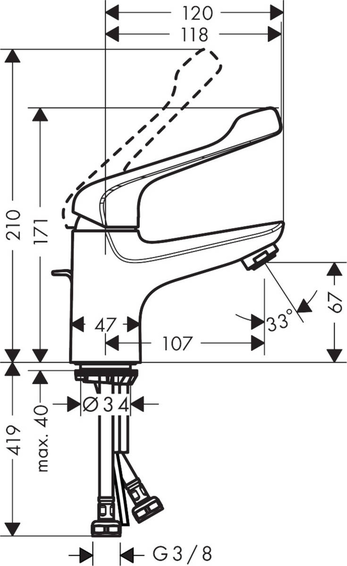 Однорычажный смеситель для раковины, слив/перелив, ComfortZone 70, крупные обозначения для лучшей видимости, удлиненная рукоятка, выступ 107 мм, тип струи: обычная струя, максимальный расход воды при давлении 3 бара: 5 л/мин, керамический узел смешивания, регулируемое ограничение температуры, подходит для проточных водонагревателей, материал сливного набора: металл, вид соединения: соединительные шланги G ⅜, донный клапан, 1¼’.
