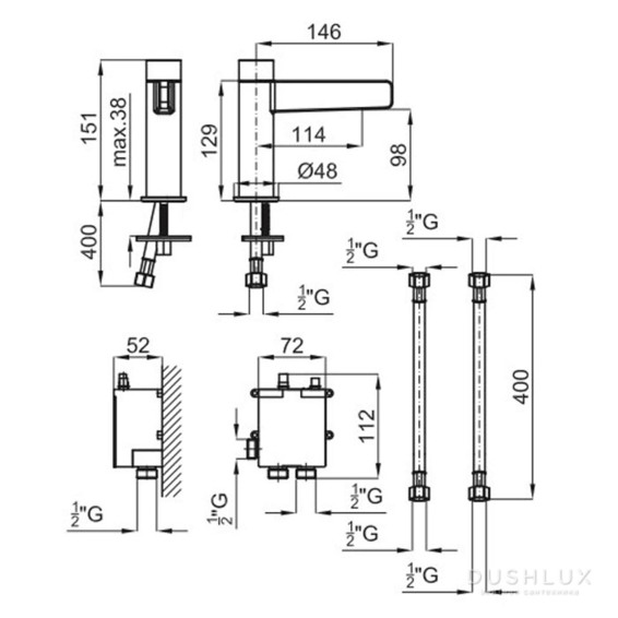 Электронный для раковины с подключением 1/2". Без донного клапана. Стоп безопасности, батарея. Необходимо подключение к электросети. Плоский аэратор. В комплект входит трансформатор 100-240 В, 50/60 Гц, выходное напряжение 9 В. Наружный смеситель 85*75*55 мм.
