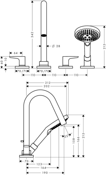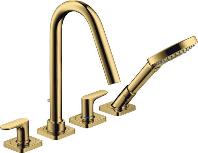 Смеситель для ванны, на 4 отверстия, монтаж на плитку, с рычаговыми рукоятками, с отдельными розетками состоит из смесителя для ванны на 3 отверстия, монтаж на плитку, ручного душа, держателя для душа, выступ 190 мм, вид соединения: скрытая часть, тип струи смесителя: обычная струя, тип струи ручного душа: Rain, RainAir, WhirlAir, максимальное расстояние, на которое вытягивается ручной душ: 1,10 м, расход воды изливом на ванны при 3 барах: 20 л/мин, расход воды ручным душем при 3 барах: 18 л/мин, мин. рабочее давление 1 бар, макс. рабочее давление: 10 бар, с керамическими вентилями для горячей/холодной воды 90°, дивертер с переключателем вакуумного типа, клапан обратного тока воды. Есть варианты в разных цветах с полированной и шлифованной обработкой.