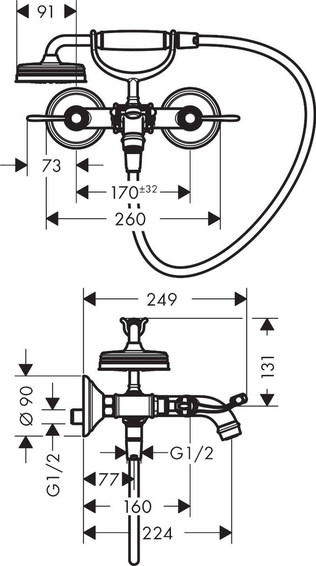 Смеситель для ванны внешнего монтажа, с рычаговыми рукоятками состоит из смесителя для ванны, с 2 рукоятками, ручного душа, шланга для душа, держателя для душа, выступ 224 мм, вид соединения: S-образные эксцентрики, межосевое подключение: 170.32 мм, тип струи смесителя: обычная струя, тип струи ручного душа: RainAir, максимальный расход воды при давлении 3 бара: 20 л/мин, расход воды изливом на ванны при 3 барах: 20 л/мин, расход воды ручным душем при 3 барах: 14 л/мин, мин. рабочее давление 1 бар, макс. рабочее давление: 10 бар, с керамическими вентилями для горячей/холодной воды 90°, клапан обратного тока воды, подходит для проточных водонагревателей. Есть варианты в разных цветах с полированной и шлифованной обработкой.