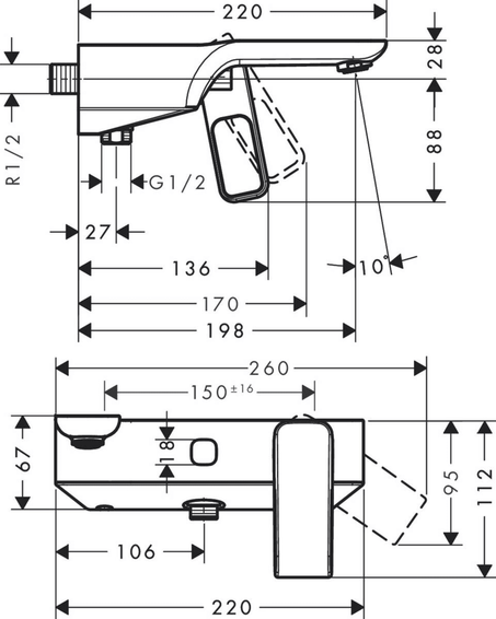 Смеситель для ванны, выступ 198 мм, вид соединения: S-образные эксцентрики, межосевое подключение: 150 мм ± 16 мм, тип струи смесителя: обычная струя, расход воды изливом на ванны при 3 барах: 24 л/мин, расход воды ручным душем при 3 барах: 18 л/мин, мин. рабочее давление 1 бар, макс. рабочее давление: 10 бар, керамический узел смешивания, регулируемое ограничение температуры, дивертер с переключателем вакуумного типа, клапан обратного тока воды, с шумопоглотителем, подходит для проточных водонагревателей.