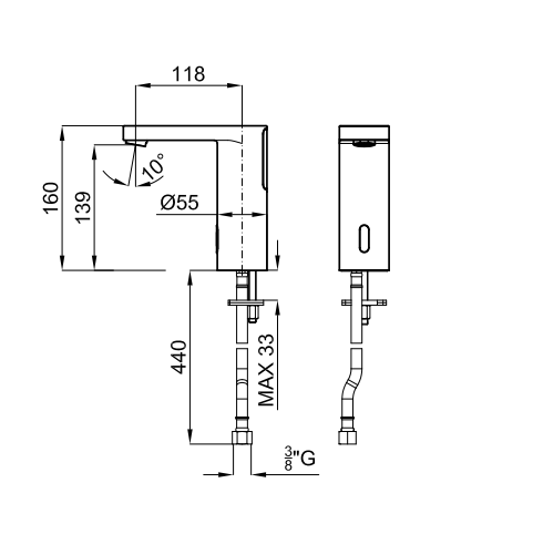 Электронный смеситель с одним подводом воды, подключение 3/8" без сливного клапана и с аэратором "plus". Батарея 3 В. Пропускная способность при давлении 3 бара 5 л/мин.