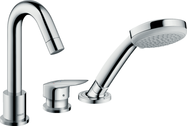 Смеситель для ванны на 3 отверстия, для монтажа на краю ванны, ручной душ, держатель для душа, выступ 111 мм, вид соединения: скрытый монтаж, тип струи смесителя: обычная струя, тип струи ручного душа: Rain, максимальное расстояние, на которое вытягивается ручной душ: 1,10 м, расход воды изливом на ванну при давлении 3 бара: 18 л/мин, расход воды ручным душем при давлении 3 бара: 15 л/мин, керамический узел смешивания, регулируемое ограничение температуры, клапан обратного тока воды.