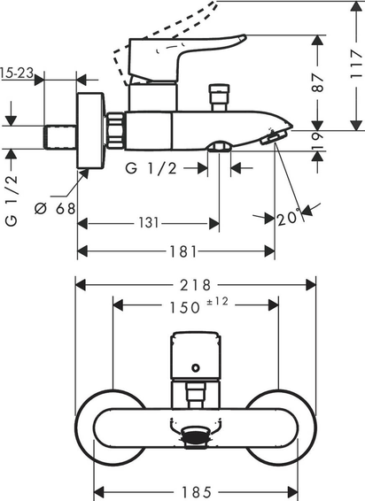 Смеситель для ванны, однорычажный, выступ 123 мм - 130,5 мм, вид соединения: S-образные эксцентрики, межосевое подключение: 150 мм ± 12 мм, тип струи смесителя: обычная струя, расход воды изливом на ванну при давлении 3 бара: 21 л/мин, расход воды ручным душем при давлении 3 бара: 8 л/мин, мин. рабочее давление 1 бар, макс. рабочее давление: 10 бар, керамический узел смешивания, регулируемое ограничение температуры, дивертер с переключателем вакуумного типа, клапан обратного тока с шумопоглотителем, подходит для проточных водонагревателей.