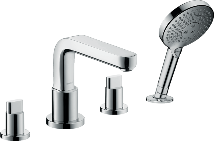 Смеситель на край ванны, на 4 отверстия, ручной душ, держатель для душа, вид соединения: скрытый монтаж, максимальное расстояние, на которое вытягивается ручной душ: 1,60 м, максимальный расход воды при давлении 3 бара: 22 л/мин, мин. рабочее давление 1 бар, макс. рабочее давление: 10 бар, с керамическими вентилями для горячей/холодной воды 90°, клапан обратного тока воды, со встроенной защитной комбинацией EN 1717.