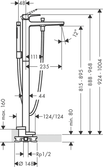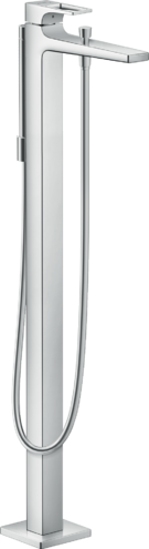 Cмеситель для ванны напольный, ручной душ-«палочка», шланг для душа, держатель для душа, выступ 235 мм, вид соединения: скрытая часть, тип струи смесителя: обычная струя, тип струи ручного душа: Rain, MonoRain, расход воды изливом на ванну при давлении 3 бара: 20 л/мин, расход воды ручным душем при 3 барах: 14 л/мин, мин. рабочее давление 1 бар, макс. рабочее давление: 10 бар, керамический узел смешивания, регулируемое ограничение температуры, дивертер с переключателем вакуумного типа, клапан обратного тока воды.
