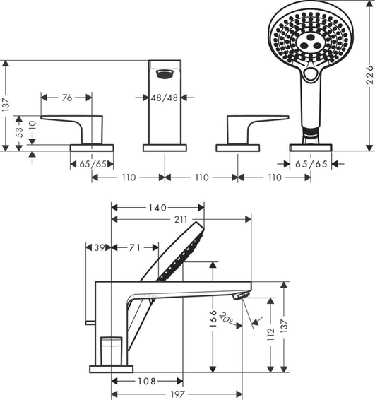 Смеситель на край ванны, на 4 отверстия, ручной душ, держатель для душа, выступ 197 мм, вид соединения: скрытый монтаж, тип струи смесителя: обычная струя, тип струи ручного душа: Rain, RainAir, Whirl, максимальное расстояние, на которое вытягивается ручной душ: 1,60 м, расход воды изливом на ванну при давлении 3 бара: 23 л/мин, расход воды ручным душем при давлении 3 бара: 15 л/мин, мин. рабочее давление 1 бар, макс. рабочее давление: 10 бар, с керамическими вентилями для горячей/холодной воды 90°.