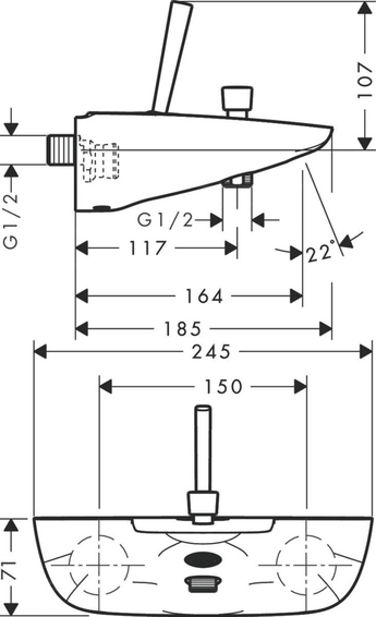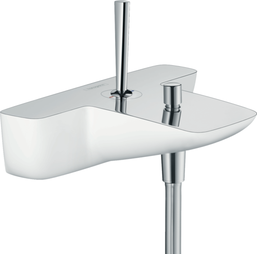 Однорычажный смеситель для ванны, выступ 164 мм, вид соединения: S-образные эксцентрики, межосевое подключение: 150 мм ± 12 мм, тип струи смесителя: обычная струя, расход воды изливом на ванну при давлении 3 бара: 19 л/мин, расход воды ручным душем при давлении 3 бара: 23 л/мин, мин. рабочее давление 1 бар, макс. рабочее давление: 10 бар, керамический узел смешивания джойстикового типа, дивертер с переключателем вакуумного типа, регулируемый формирователь струи, клапан обратного тока воды с шумопоглотителем, подходит для проточных водонагревателей. Есть вариант в бело-хромовом цвете - арт. 15472400