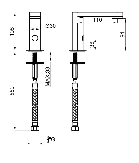 Электронный смеситель с одним подводом воды, подключение 3/8" без сливного клапана. Батарея 3 В. Пропускная способность при давлении 3 бара 6,8 л/мин.