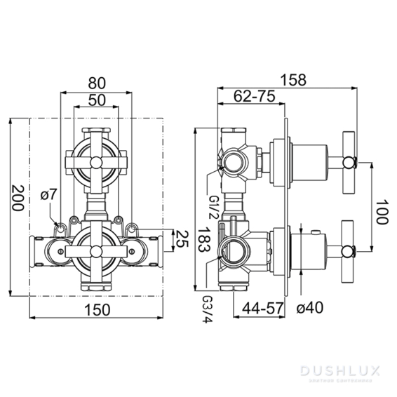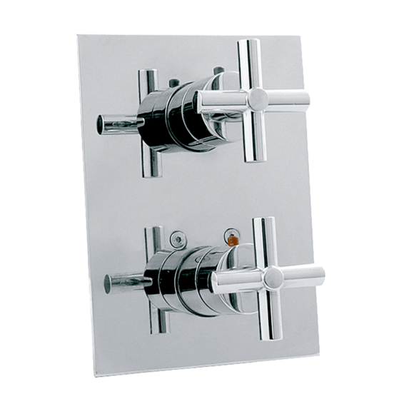 Смеситель с термостатом скрытого монтажа на два отверстия с элементом покрытия из воска. Подключение 1/2"-3/4" согласно плану и ручной переключатель. Пропускная способность при давлении 3 бара: для ванны - 26 л/мин, душ - 13 л/мин, включает клапан анти-возвращения и предохранитель на 38⁰С.
