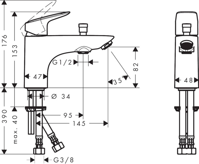 Смеситель для ванны и душа Monotrou, однорычажный, выступ 145 мм, вид соединения: соединительные шланги G ⅜, тип струи смесителя: обычная струя, максимальный расход воды при давлении 3 бара: 20 л/мин, керамический узел смешивания, регулируемое ограничение температуры, дивертер с переключателем вакуумного типа, подходит для проточных водонагревателей.