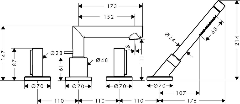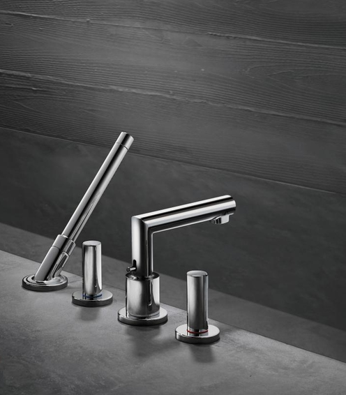 Смеситель с рукоятками zero состоит из смесителя на край ванны, на 4 отверстия, ручного душа-«палочки», набора шлангов Secuflex, держателя для душа, выступ 152 мм, вид соединения: скрытая часть, тип струи смесителя: обычная струя, тип струи ручного душа: Rain, Mono, максимальное расстояние, на которое вытягивается ручной душ: 1,10 м, максимальный расход воды при 3 бар: 22 л/мин, мин. рабочее давление 1 бар, макс. рабочее давление: 10 бар, с керамическими вентилями для горячей/холодной воды 90°. Есть варианты в разных цветах с полированной и шлифованной обработкой.