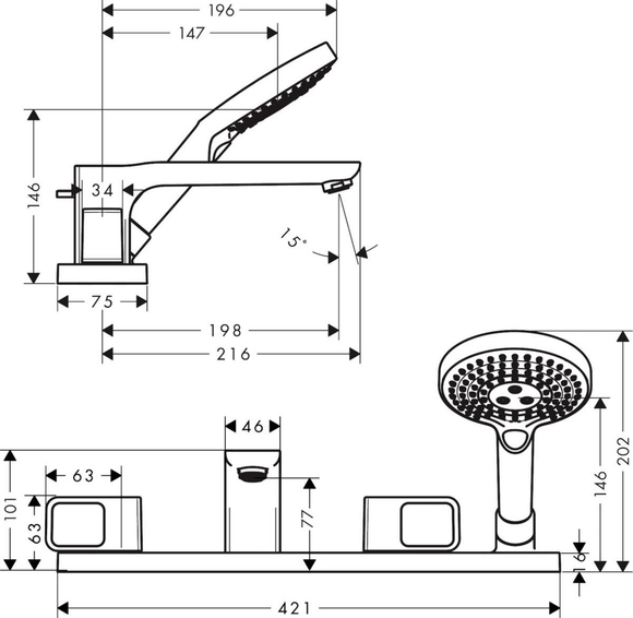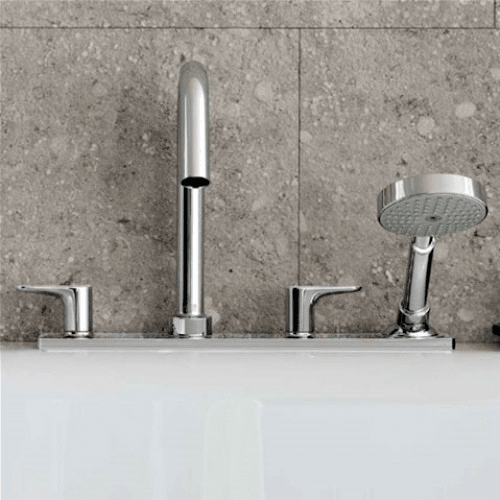 Смеситель на край ванны состоит из смесителя на край ванны, на 4 отверстия, ручного душа, шланга для душа, держателя для душа, выступ 198 мм, вид соединения: скрытая часть, тип струи смесителя: обычная струя, тип струи ручного душа: Rain, RainAir, WhirlAir, максимальное расстояние, на которое вытягивается ручной душ: 1,10 м, максимальный расход воды при давлении 3 бара: 22 л/мин, мин. рабочее давление 1 бар, макс. рабочее давление: 10 бар, с керамическими вентилями для горячей/холодной воды 90°, дивертер с переключателем вакуумного типа, клапан обратного тока воды.