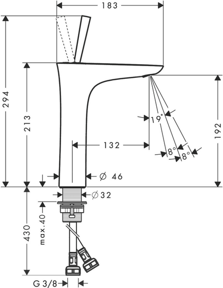 Однорычажный смеситель для раковины, слив/перелив, ComfortZone 200, выступ 132 мм, тип струи: ламинарная струя, регулируемый формирователь струи, максимальный расход воды при давлении 3 бара: 5 л/мин, керамический узел смешивания джойстикового типа, подходит для проточных водонагревателей, сливной клапан Push-Open G 1 ¼, материал сливного набора: металл, вид соединения: соединительные шланги G ⅜. Есть вариант в бело-хромовом цвете - арт. 15081400
