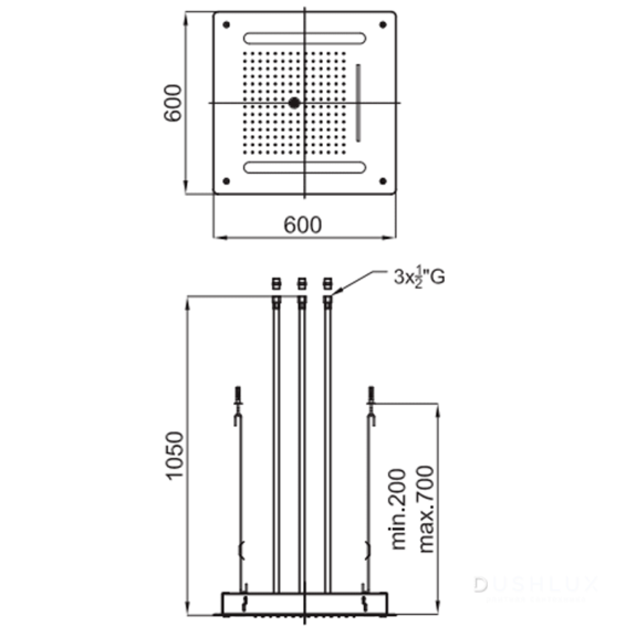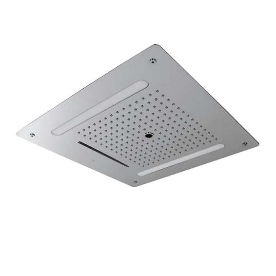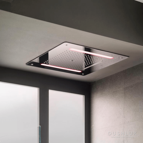 Верхний душ встраиваемый в потолок 60 см. Основные функции: дождь, каскад и центральная струя. Дополнительная функция: хромотерапия. В комплект входит пульт управления хромотерапией с защитой IP67. Напряжение питания 220В. Смеситель не входит в комплект. Для обеспечения работы душа необходимо заказывать смеситель с тремя выходами. Минимально необходимая пропускная способность для каскада - 21 л/мин и 16 л/мин для функции дождя центральной струи.