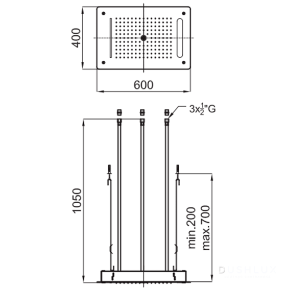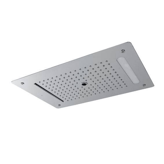 Верхний душ встраиваемый в потолок 60*40 см. Основные функции: дождь, каскад и центральная струя. Дополнительная функция: хромотерапия. В комплект входит пульт управления хромотерапией с защитой IP67. Напряжение питания 220В. Смеситель не входит в комплект. Для обеспечения работы душа необходимо заказывать смеситель с тремя выходами. Минимально необходимая пропускная способность для каскада - 21 л/мин и 16 л/мин для функции дождя центральной струи.