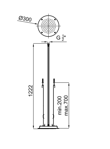 Верхний душ, встраиваемый в потолок 30 см. Пропускная способность при давлении бара 9 л/мин.