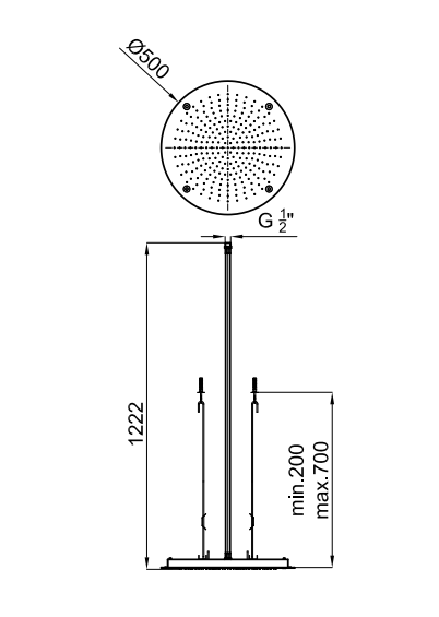 Верхний душ, встраиваемый в потолок 50 см. Пропускная способность при давлении бара 15 л/мин.
