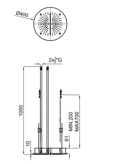 Верхний душ, встраиваемый в потолок 40 см. Основные функции: дождь и каскад. Смеситель не входит в комплект. Для обеспечения работы душа необходимо заказывать смеситель с двумя выходами. Минимально необходимая пропускная способность для каскада - 21 л/мин и 16 л/мин для функции дождя.