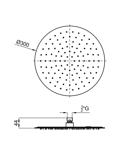 Верхний душ 30 см, с шаровыми соединениями. Пропускная способность при давлении бара 12 л/мин.