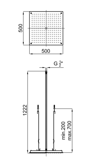 Верхний душ, встраиваемый в потолок 50 см. Пропускная способность при давлении 3 бара 18 л/мин.
