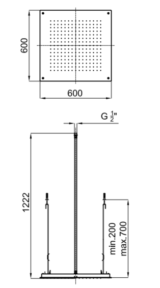 Верхний душ, встраиваемый в потолок 60 см. Пропускная способность при давлении 3 бара 18 л/мин.