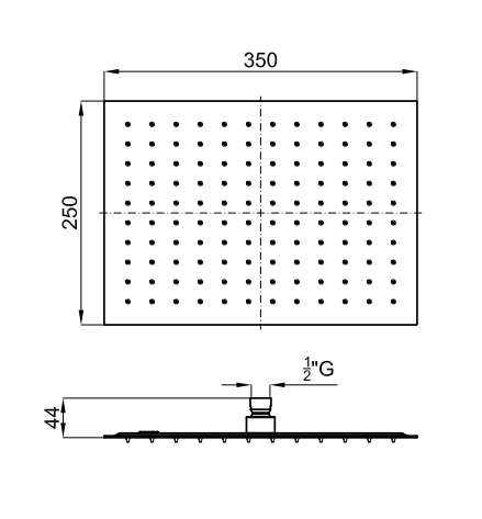 Верхний душ 35x25 см, с шаровыми соединениями. Пропускная способность при давлении бара 12 л/мин.