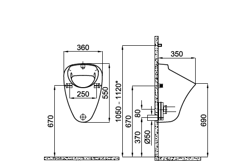 Писсуар с верхним подводом и боковым креплением. с крепежными элементами. В комплект входит сифон. Может устанавливаться на капитальной стене или перегородке. Дополнительно укомплектовывается: - разделителем для писсуара - арт. 100090782 - цена: 58830 тг. - кнопкой смыва для писсуара - арт. 100083080 - цена: 71020 тг. - наружней кнопкой смыва с соединением для писсуара 1/2" - арт. 100067698 и 100067692 - цена: 90630 тг.