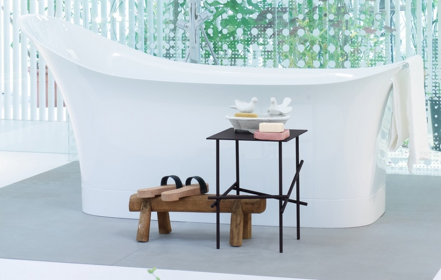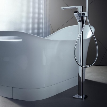AXOR URQUIOLA предлагает смеситель на борт ванны на три отверстия и напольный термостат для ванны, как здесь на изображении. Наряду с раковинами в виде ушата и обычной раковиной, в коллекции представлена также свободно стоящая ванна. Ванна и все раковины изготовлены из минерального литья, что придает им необычайную прочность и долговечность. Благодаря покрытию гелькоутом поверхность приятна на ощупь, блестит и устойчива к царапинам. С продуманной и современной функциональностью ванна и раковины обладают архетипичными формами, напоминающими классические предметы из прошлого.