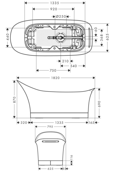Ванна отдельно стоящая, высота наполнения: около 340 мм, емкость: около 180 л (1 чел. 70 кг), вес с водой (1 чел 70 кг): около 440 кг, вес без воды: 187 кг, из минерального литья с гелькоутом.