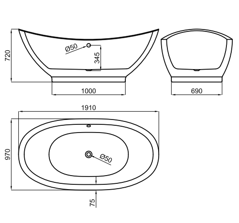 Ванна без электронного оборудования, отдельностоящая, без смесителя, овальной формы, 191*97 см, цельнолитая, слив в центре, акриловая. Дополнительно укомплектовывается сифоном - арт. 100158208 - цена: 4240 тг